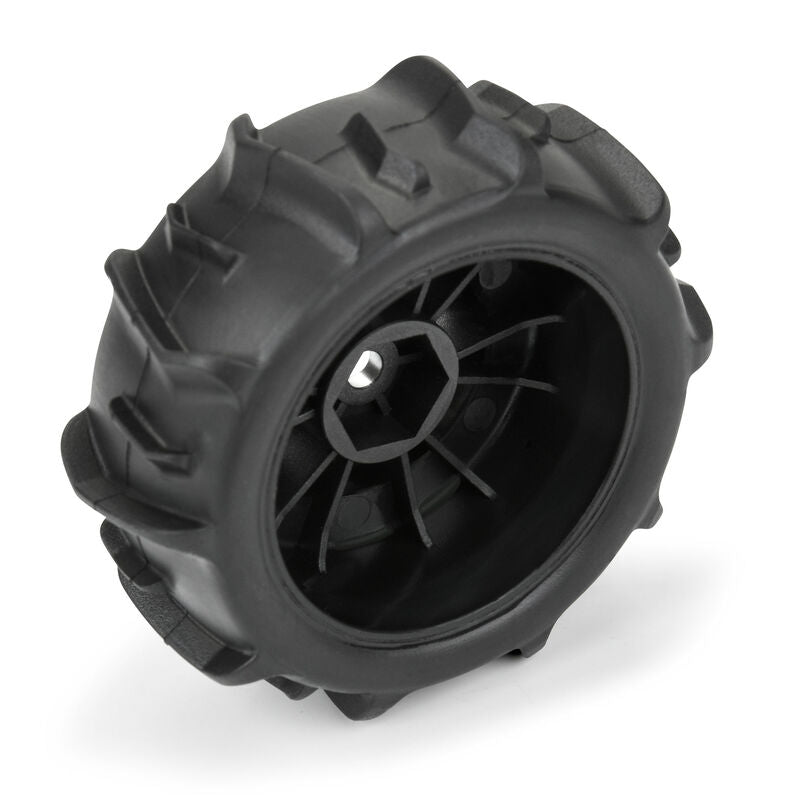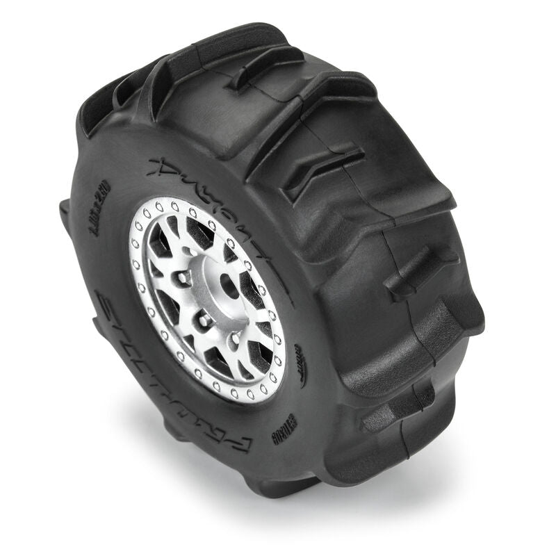 PRO1030910 | Dumont 1.2"1.7" Paddle Sand Tires Mounted on Impulse Satin Silver 12mm Hex Wheels (4) for ARRMA® Mojave™ GROM Front and Rear