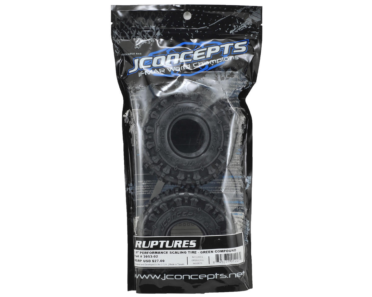 The super soft green compound grips like a monster, while the tall (125mm) profile JConcepts tire for 1.9” wheels tackles even the most treacherous terrain. The Ruptures are that extremely tacky yet versatile tire trailing drivers lust for. The design starts with a layout of individual “large islands” that react to directional and forward loading characteristics like a soft gummy candy. The long horizontal attack bars are connected with solid sidewall detail which braces the sidewall for the high impact situations. The center “mini islands” help maintain spinning speed and at half height provide some space to sling clean during those dirty trail runs.
